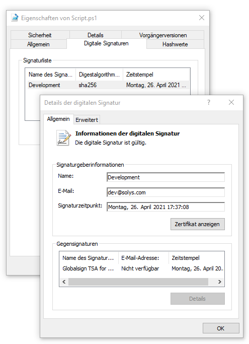 Sie können im Rev\n-Unterverzeichnis des Paketverzeichnisses prüfen, ob die angegebenen Dateien korrekt signiert wurden, indem Sie in den Eigenschaften auf das Register "Digitale Signaturen" wechseln in die dortigen Angaben überprüfen.