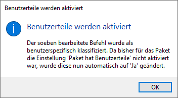 Hinweis: seit Version 4.5 der Packaging PowerBench wird für Pakete, für die bisher die Eigenschaft "Paket hat Benutzerteile" nicht aktiviert war, diese automatisch aktiviert, wenn ein Befehl eingefügt wird, der automatisch benutzerspezifisch klassifiziert wird oder wenn Sie einen Befehl manuell benutzerspezifisch klassifizieren.