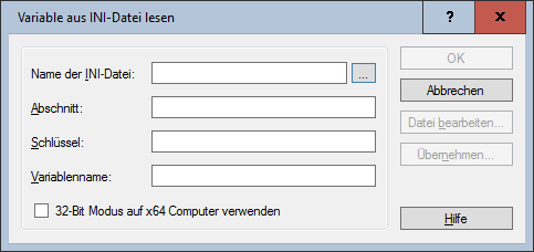 Dieser Befehl liest Informationen aus bestehenden INI-Dateien. Im Dialogfeld wird spezifiziert, welcher Schlüssel aus welchem Abschnitt in welcher INI-Datei gelesen werden soll.