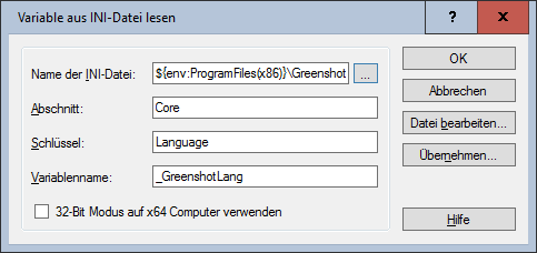 Das folgende Beispiel liest aus der Datei Greenshot.ini im 32-bittigen Programme-Verzeichnis aus dem Abschnitt Core den Wert des Schlüssels Language aus und speichert den Inhalt in der Variablen _GreenshotLang: