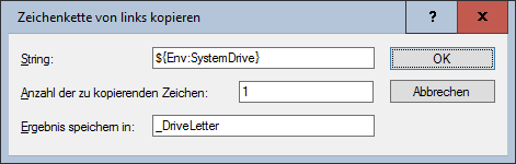 Das Beispiel ermittelt den Laufwerksbuchstaben des Systemlaufwerks (ohne den Doppelpunkt), indem es das erste linke Zeichen aus der Umgebungsvariablen %SystemDrive% ausliest und in der lokalen Variablen _DriveLetter speichert:
