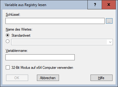 Dieser Befehl liest Informationen aus der Registry. Im Dialogfeld wird festgelegt, welcher Wert aus welchem Schlüssel gelesen werden soll. Der gelesene Wert wird in der in angegebenen Variable abgelegt und steht im weiteren Paket zur Verfügung.
