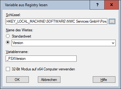 Name der Variablen, in welcher der ausgelesene Wert gespeichert wird. Geben Sie nur den Namen der Variablen an, nicht das $-Zeichen und die geschweiften Klammern. - 32-Bit Modus auf x64 Computer verwenden