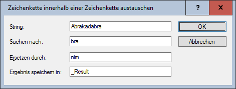 Das folgende Beispiel verwandelt den Zauberspruch Abrakadabra durch Ersetzen der Teilzeichenkette bra durch nim in Animkadanim, was dann in der Variablen _Result abgelegt wird: