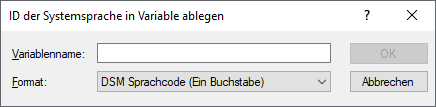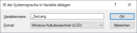 Liest die ID der Standard Windows-Systemsprache aus und speichert das Ergebnis in einer Variablen. Dabei kann angegeben werden, in welchem Format die ID ausgelesen wird.
