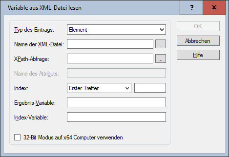 Dieser Befehl liest Informationen aus bestehenden XML-Dateien. Im Dialogfeld wird spezifiziert, welche Information (Element, Attribut, Inhalt) aus welcher XML-Datei gelesen werden soll.