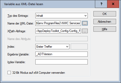 Das Beispiel liest die Version des App Deployment Toolkit aus der XML-Datei AppDeployToolkitConfig.xml und speichert das Ergebnis in der Variablen _ADTVersion: