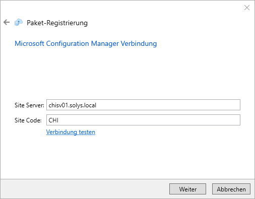 Hinweis: Sie können hier auch andere Verbindungsdaten eintragen, wenn Sie zum Beispiel ein Paket testweise in einer anderen Configuration Manager Installation registrieren möchten. Wenn Sie die Daten hier überschreiben, werden die konfigurierten Integrationseinstellungen nicht geändert. |