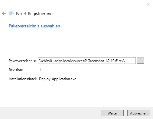 - Bestätigen Sie das vorausgewählte Paketverzeichnis oder wählen Sie das zu registrierende Paketverzeichnis über die "..."-Schaltfläche aus. Das Label "Revision" zeigt Ihnen die ausgewählte Paketrevision, das Label "Installationsdatei" sagt Ihnen, dass das Executable "Deploy-Application.exe" zur Ausführung des Pakets aufgerufen werden wird. Bestätigen Sie die Auswahl mit "Weiter".