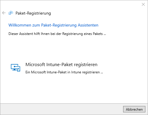 - Es öffnet der Paket-Registrierung Assistent, auf dem Sie bitte die Schaltfläche "Microsoft Intune-Paket registrieren" drücken.