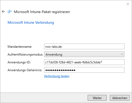 - Auf der folgenden Assistenten-Seite sehen Sie die in der Konfiguration der Intune-Integration eingetragenen Verbindungsdaten. Sie können über den Link "Verbindung testen" prüfen, ob die Verbindungsdaten korrekt eingetragen wurden und funktionieren. Bestätigen Sie die Verbindungsdaten mit "Weiter".