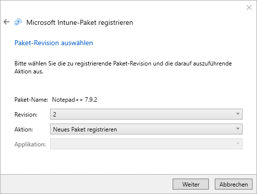 Hinweis: Wenn Sie das Paket bereits in das Intune-Format exportiert haben, haben Sie in der Dropdown-Liste des "Revision" Feldes einen Eintrag mit "(exportiertes Paket)" am Ende. Wählen Sie diesen Eintrag, wenn Sie die exportierte Version des Pakets registrieren möchten. |