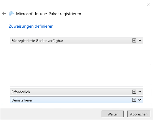 - Auf dieser Assistenten-Seite können Sie das Paket nun direkt zuweisen. Es stehen Ihnen die aus Intune bekannten Zuweisungen "Verfügbar", "Erforderlich" und "Deinstallieren" zur Verfügung.