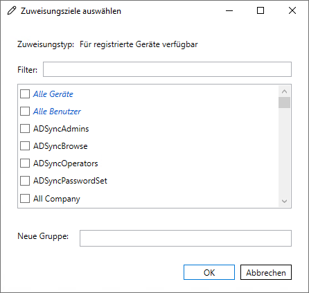 Verwenden Sie das "+" Symbol, um eine Zuweisung der jeweils gewählten Art zu erzeugen und wählen Sie im sich öffnenden Dialog, für welche Gruppen die Zuweisung erstellt werden soll. Sie können an dieser Stelle auch mehrere Gruppen auswählen, für die dann jeweils eine Zuweisung erzeugt wird. Bestätigen Sie dann Ihre Auswahl mit OK.