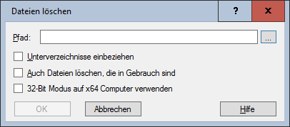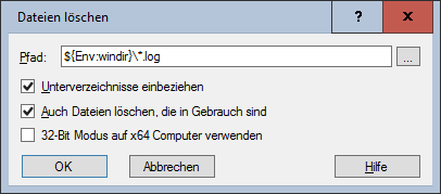Pfad zu der oder den zu löschenden Datei(en). Die Verwendung der Wildcards * und ? sowie von Variablen ist möglich. Wählen Sie über die "..."-Schaltfläche eine (auf dem Paketiersystem) bestehende Datei aus oder geben Sie den Pfad manuell an. - Unterverzeichnisse einbeziehen
