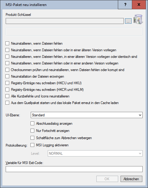 Die Produkt-GUID des MSI-Files, das Sie neu installieren möchten. Wählen Sie über die "..."-Schaltfläche eine (auf dem Paketiersystem vorhandene) MSI-Datei aus oder geben Sie den Pfad manuell an. - Neuinstallieren, wenn Dateien fehlen