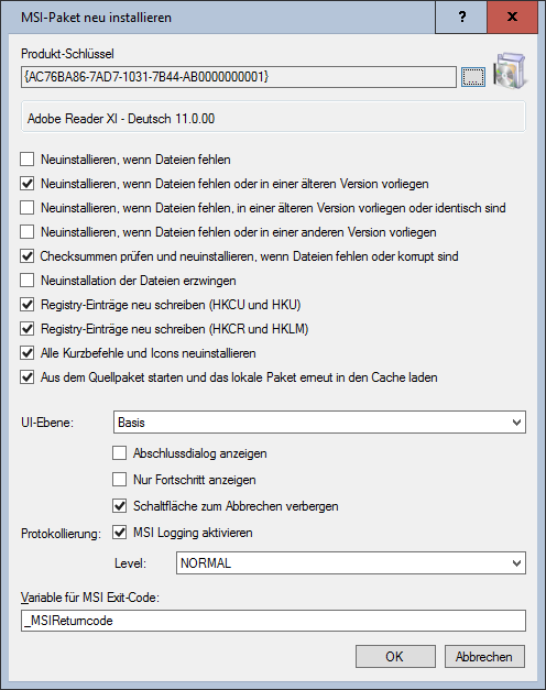 Das untenstehende Beispiel repariert den Adobe Reader XI mit den ausgewählten Optionen: