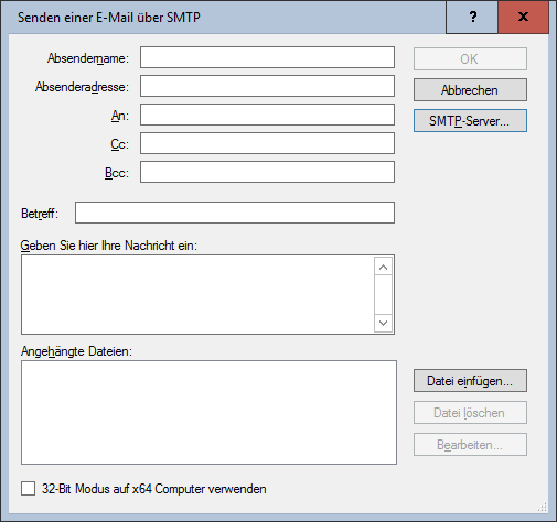 Dateien, die an das E-Mail angehängt werden sollen. Es können mehrere Dateien angehängt werden. Variablen werden unterstützt. - 32-Bit Modus auf x64 Computer verwenden