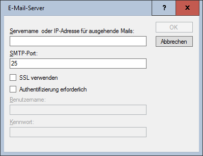 Es öffnet sich der Dialog "E-Mail-Server". Geben Sie dort den E-Mail-Server unter Verwendung der IP-Adresse oder des Computernamens an sowie weitere Parameter für die Verbindung zum Mail-Server an. Variablen werden unterstützt.