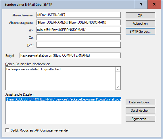 Wenn das Script auf einem 64-Bit Betriebssystem ausgeführt wird, kann bei Referenzierung auf das SYSTEM32-Verzeichnis automatisch das Pendant für 32-Bit Applikationen SysWOW64 verwendet werden. - Schaltfläche "SMTP-Server"