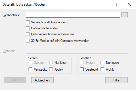 Wenn Sie für das Ändern der Verzeichnis- oder Dateiattribute auch die Unterverzeichnisse des unter "Verzeichnis" angegebenen Verzeichnisses ändern möchten, aktivieren Sie diese Option. - 32-Bit Modus auf x64 Computer verwenden
