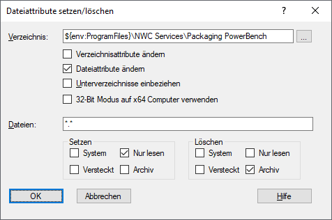 Das folgende Beispiel setzt das "Nur lesen"-Attribut und löscht das "Archiv"-Attribut für alle Dateien im Packaging PowerBench-Verzeichnis.