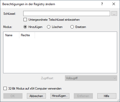 Die Auswahl dieser Option öffnet das Dialogfeld "Zugriffsrechte definieren", in dem Sie individuell die festzulegenden Berechtigungen angeben. - 32-Bit Modus auf x64 Computer verwenden