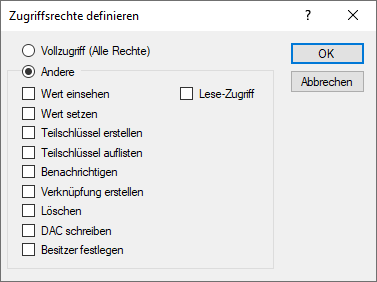 Enthält die Zugriffsrechte "Wert einsehen", "Wert setzen", "Teilschlüssel erstellen", "Teilschlüssel auflisten", "Benachrichtigen", "Verknüpfung erstellen", "Löschen", "DAC schreiben", "Besitzer festlegen" und "Lese-Zugriff". - Lesen
