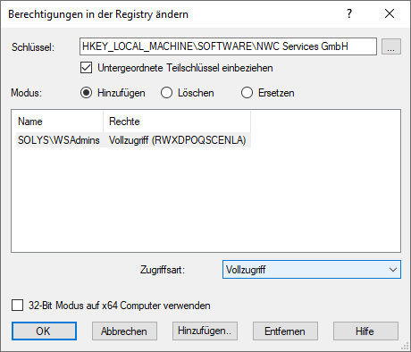 Das folgende Beispiel ergänzt die bestehenden Berechtigungen im Schlüssel HKLM\SOFTWARE\NWC Services GmbH um Vollzugriff inklusive Unterschlüssel für die Gruppe lokaler Workstation-Administratoren "WSAdmins":