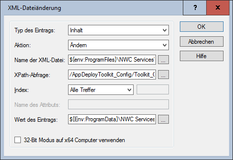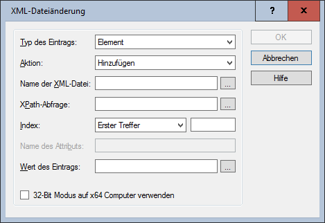 Legt für die Aktionen Hinzufügen und Ändern den XML-Inhalt fest, welcher in der XML-Datei ersetzt beziehungsweise hinzugefügt werden soll. Zur Eingabe komplexer und mehrzeiliger Inhalte öffnen Sie mit Klick auf die Schaltfläche ... einen Editor. Die Verwendung von Variablen ist möglich. - 32-Bit Modus auf x64 Computer verwenden