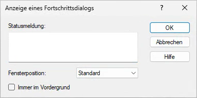 Erzeugt einen Fortschrittsdialog mit einem beliebigen Text in einem separaten Prozess. Durch wiederholtes Aufrufen des Befehls kann ein bereits erzeugter Fortschrittsdialog aktualisiert werden. In den Optionen legen Sie fest, an welcher Position der Dialog eingeblendet wird und ob dieser im Vordergrund angezeigt werden soll.