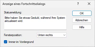 Das nachfolgende Beispiel erzeugt einen Fortschrittsdialog, der während des Systemupdates unten rechts auf dem Bildschirm angezeigt wird und sich im Vordergrund befindet.