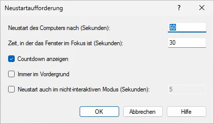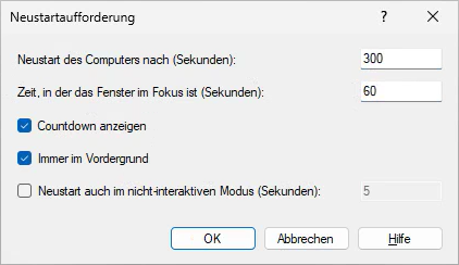 Erzeugt einen Neustartdialog mit einem Countdown bis zum erzwungenen Neustart an. In den Optionen legen Sie die Zeit bis zum Neustart fest und entscheiden, ob diese in Form eines Countdown angezeigt wird. Weiterhin definieren Sie das Verhalten des Dialoges und aktivieren bei Bedarf die Unterstützung des Befehls im nicht-interaktivem Modus.