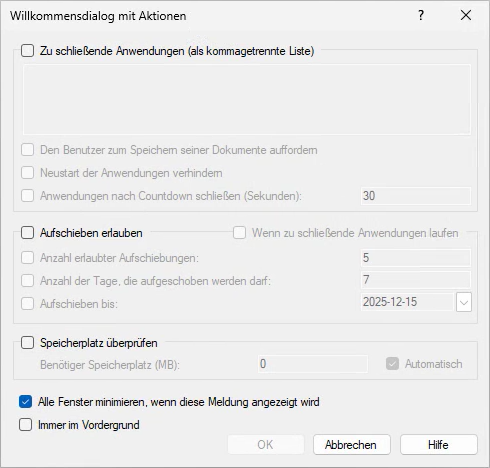 Erzeugt einen Willkommensdialog, der den Benutzer mit Informationen über die anstehende Installationen und Aktionen, die vor Beginn der Installation durchgeführt werden müssen, versorgt. In den Optionen definieren Sie zu schließende Applikationen und entscheiden, wie sich diese beim und nach dem Schließen verhalten sollen. Weiterhin legen Sie fest ob, ein Aufschub der Installation für eine bestimmte Anzahl von Versuchen, Tagen oder bis zu einem bestimmten Enddatum möglich ist.