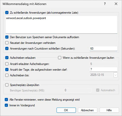 Ermöglicht die Anzeige eines Countdowns in Sekunden, bis die angegebenen Anwendungen automatisch geschlossen werden. Diese Option wird nur wirksam sofern ein Aufschub nicht erlaubt oder der dafür definierte Wert abgelaufen ist. - Aufschieben erlauben
