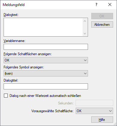 Zeigt ein Dialogfeld mit einer beliebigen Nachricht und verschiedenen Schaltflächen an; der Wert der gedrückten Schaltfläche wird bei Bedarf in einer Variablen gespeichert. In den Optionen steuern Sie die Aktivierung der ausgewählten Schaltflächen und legen ein Zeitintervall fest, wann das Dialogfenster geschlossen wird, falls keine Benutzeraktion stattgefunden hat.