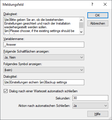 Das folgende Beispiel definiert eine Meldung in Deutsch und Englisch, bei der sich der Benutzer entscheiden soll, ob er eine Sicherung der existierenden Einstellungen wünscht.