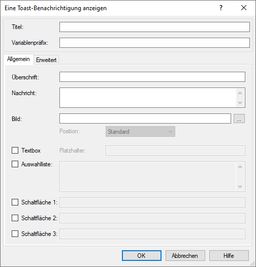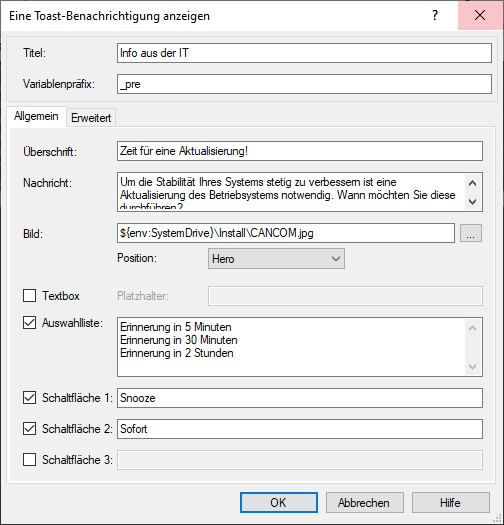 Erzeugt eine Toast-Benachrichtigung mit einem beliebigen Titel, einer beliebigen Überschrift sowie Nachricht. In den Optionen aktivieren Sie optionale Schaltflächen, eine Textbox und eine Auswahlliste. Zur Personalisierung der Benachrichtigung kann ein benutzerdefiniertes Bild an unterschiedlicher Position eingeblendet werden. Für eine noch flexiblere Definition der angezeigten Meldunge steht die Registerkarte 'Erweitert' zur Verfügung auf der die Benachrichtigung in Form von XML-Code bearbeitet werden kann.