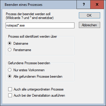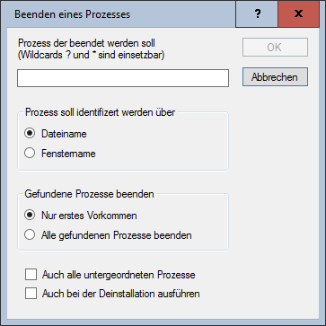 Name des Prozess-Executables oder des Fenstertitels der oder die zu beendenden Prozesse. Dabei sind die Wildcards * und ? sowie Variablen erlaubt. - Prozess soll identifiziert werden über