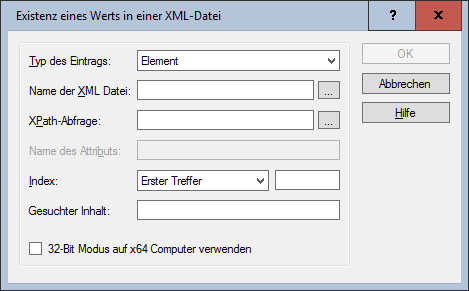 Prüft die Existenz eines Wert in einer bestimmten XML-Datei. Neben der XML-Datei müssen Sie in dieser Bedingung auch festlegen, welcher Eintrag in der XML-Datei geprüft werden soll. Zu diesem Zweck legen Sie den Typ des Eintrags und eine XPath-Abfrage fest. Diese Abfrage funktioniert analog zum Befehl Read-XmlNode.