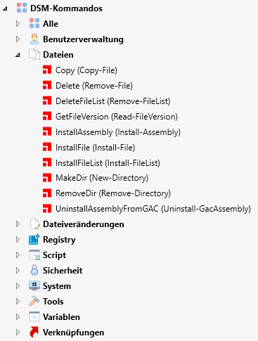 Um Ihnen den Einstieg oder Umstieg von DSM zu erleichtern, haben wir in die Befehlsliste einen weiteren Knoten "DSM-Kommandos" aufgenommen. Die dort aufgelisteten Befehlsnamen sind lediglich Aliase auf die eigentlichen Cmdlets des PackageDeployment Moduls. Da die meisten erfahrenen DSM-Paketierer aber die Namen der gängigen Befehle auswendig kennen, erspart Ihnen diese Liste das zeitraubende Suchen nach den DSM-Pendants. Der "echte" Name des Cmdlets steht dabei in Klammern hinter dem DSM-Befehl, sodass Sie mit der Zeit automatisch die "neuen Befehle" lernen. Wenn Sie keinen Bedarf mehr an den DSM-Kommandos haben, können Sie diese Alias-Liste über die Konfigurationsdatei ausblenden.