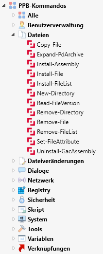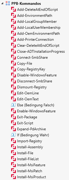 Im PPB Fenster finden Sie die Cmdlets, die das Modul bereitstellt, in der Befehlsliste auf der linken Seite unter dem Modul-Knoten "PackageDeployment". Standardmäßig sind die Befehle in Kategorien eingeteilt, die Sie auch aus der Befehlsliste in der DSM Packaging Workbench kennen. Das erleichtert Ihnen, den gesuchten Befehl zu finden.