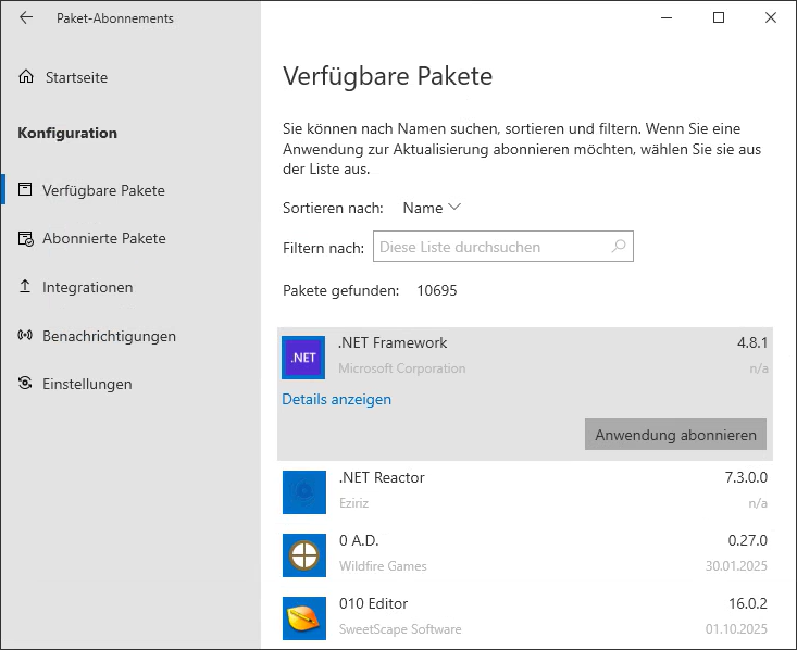 Um die Liste der abonnierbaren Pakete einzusehen, klicken Sie auf den Schaltfläche "Verfügbare Pakete". Sie sehen daraufhin eine Liste aller im Winget-Repository enthaltenen Pakete.