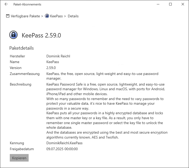 Wenn Sie eine Applikation markieren, können Sie deren Detail-Informationen über den Link "Details anzeigen" einsehen. Dabei werden Ihnen die in Winget verfügbaren Informationen zu Hersteller, Name, Version, Zusammenfassung, Beschreibung, Kennung und Freigabedatum angezeigt. Über die "Kopieren"-Schaltfläche können Sie diese Informationen in die Zwischenablage kopieren. Über den 🡨 Button in der Titelzeilen kommen Sie zur Gesamtliste zurück.