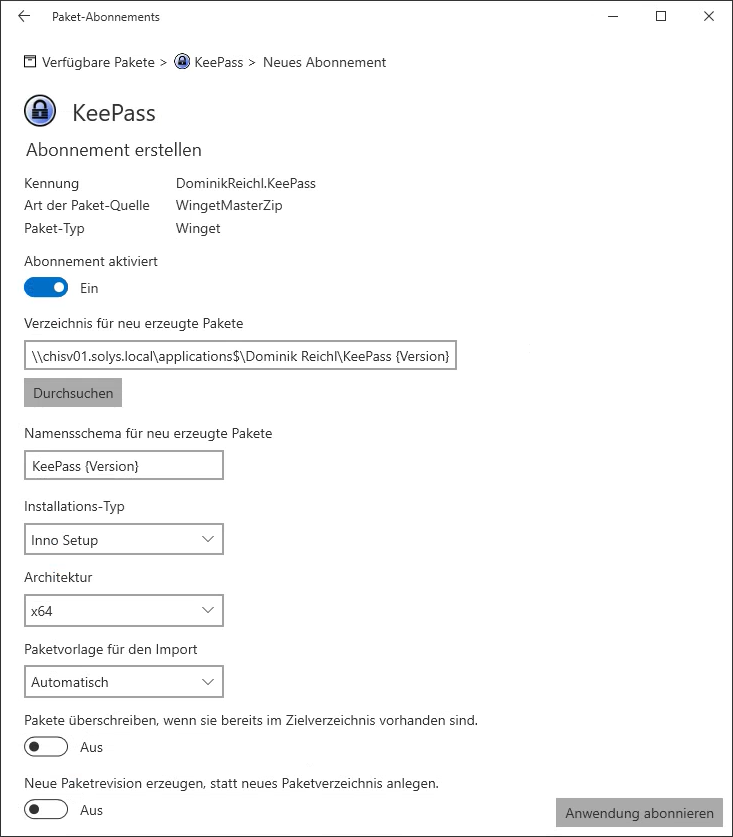Auch hier wird die Vorgabe für den Benamung der erzeugten Pakete aus der Konfiguration übernommen, kann jedoch individuell für dieses Abonnement angepasst werden. - Installations-Typ