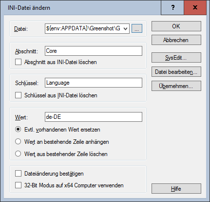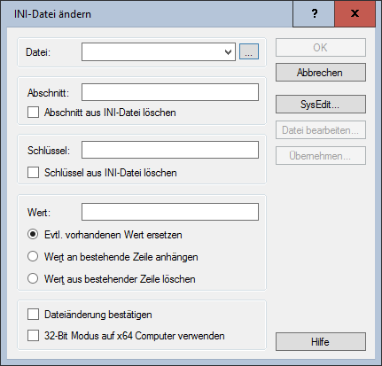 Wird "Schlüssel aus INI-Datei löschen" angekreuzt, wird der angegebene Schlüssel gelöscht. - Wert