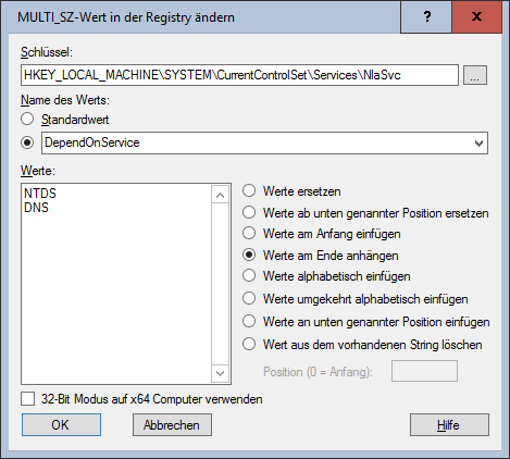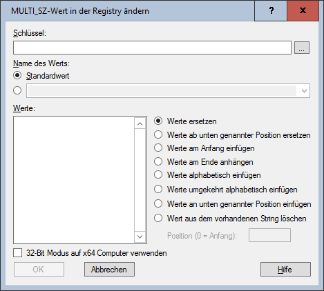 Der oder die in den MULTI_SZ Wert einzutragenden Werte. Über die Aktion wird näher bestimmt, wie der Wert zu setzen ist. - Werte ersetzen