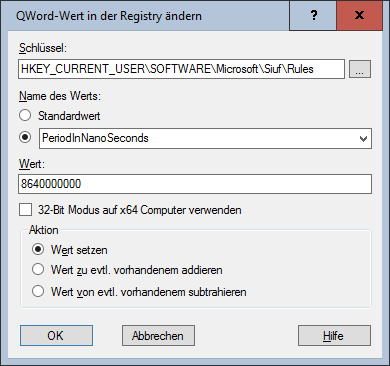 Das untenstehende Beispiel ändert im Schlüssel HKEY_CURRENT_USER\SOFTWARE\Microsoft\Siuf\Rules den Inhalt des Werts PeriodInNanoSeconds auf den Wert 8640000000 und überschreibt dabei einen eventuell vorhandenen Inhalt.
