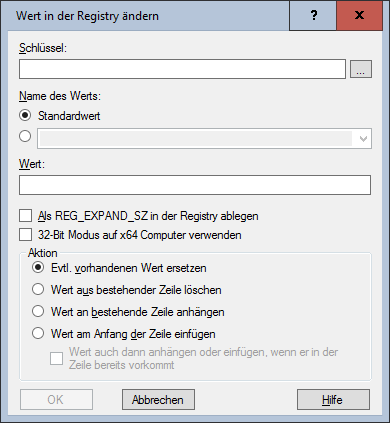 Die zu setzende Zeichenkette. Über die Aktion wird näher bestimmt, wie der Wert zu setzen ist (Setzen, Löschen, Anhängen, Einfügen). - Als REG_EXPAND_SZ in der Registry ablegen