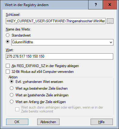 Das folgende Beispiel setzt die Spaltenbreiten für die Ansicht der Applikation WinMerge in der Registry des aktuellen Benutzers: